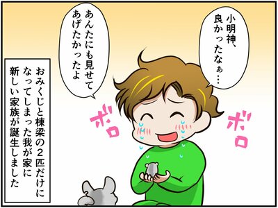 そんなある日のこと。徹夜で仕事をしていた祭さんの耳に、おみくじちゃんのケージのほうからピィピィと聞きなれない声が聞こえてきました。見ると、彼女の足元に、小さな物体が鳴きながら動いているではありませんか!なんと、おみくじちゃんのお腹にはこれまでずっと命が宿っていて、今まさに出産したところだったのです!
