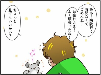漫画家の祭さんは、小明神さんとおみくじちゃんというチンチラの夫婦、そしてデグーの棟梁ちゃんと一緒に生活していました。しかし、夫チンチラの小明神さんは、胸に膿が溜まる胸腔膿瘍を患い、胸にチューブを入れるドレーン手術に挑んだものの、麻酔から目覚めることができずに亡くなってしまいます。(第53話)