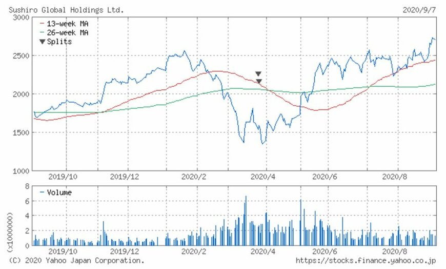 しかし、反転して7月には年初来高値2,630円に到達。いったん2,200円台まで下落した後に再度上昇しており、直近は2,700円前後で取引されています(なお、2020年3月31日に1株→4株の株式分割を実施)。