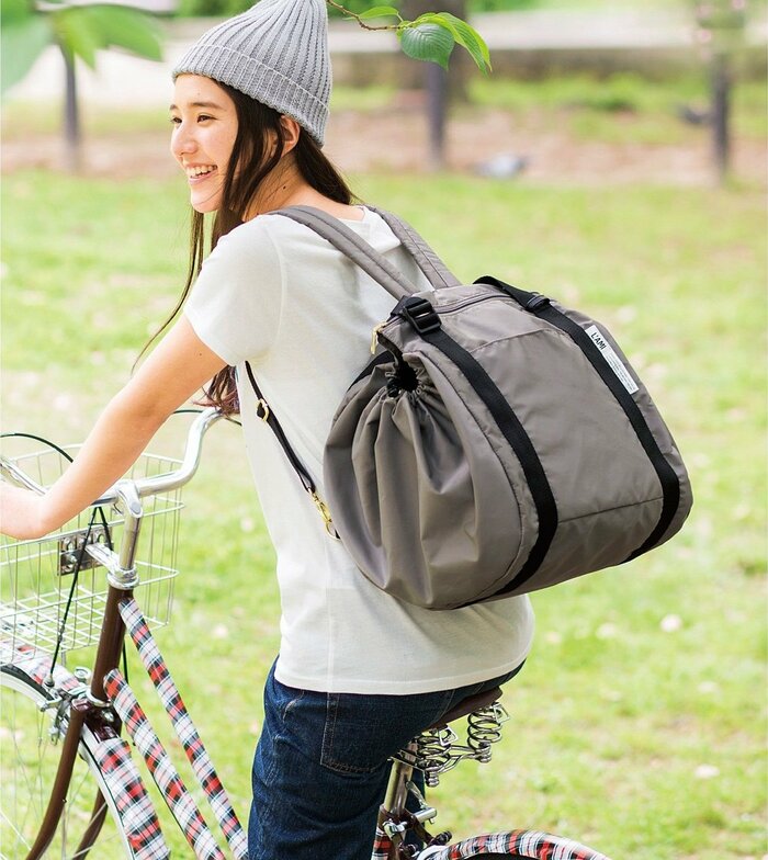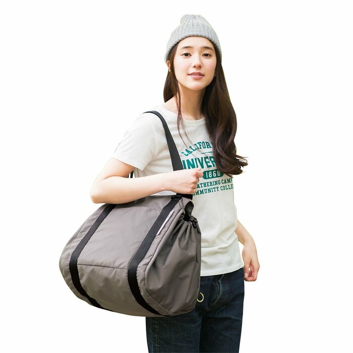 サイズは 縦約38.5cm(持ち手含まず)×横約31cm×マチ幅約36cm(ひもをしぼった状態)で、収納力も抜群です。旅行バッグや防災バッグとして使用している人もいるのだとか。