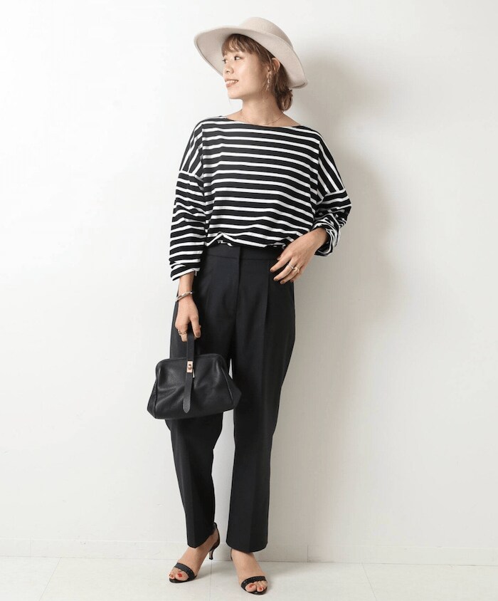 ブラックを基調にしたスタイリッシュなコーディネート。キレイめなテーパードパンツを合わせることでより大人っぽい雰囲気に。