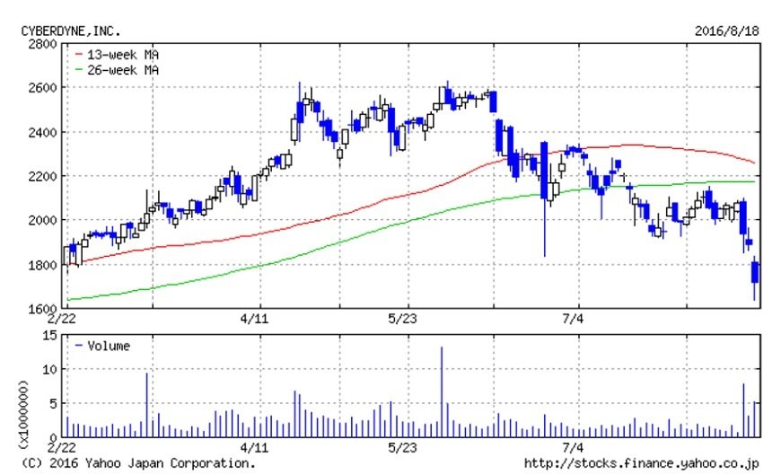 続く2件目は、同じ米国の空売りファンドであるシトロン・リサーチが8月16日に、東証マザーズ上場の精密機械メーカーCYBERDYNE(7779)に対して、事実上の“売り推奨”となる目標株価を付けたことです。CYBERDYNEはロボットスーツで大きな注目を集める新興企業です。