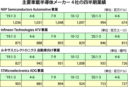 20年4~6月期における主な車載半導体メーカーの売上高を見ると、NXP Semiconductors(オートモーティブ事業)が前年同期比35%減、Infineon Technologies(ATV事業)が同8%減、ルネサス エレクトロニクス(自動車向け事業)が同23.2%減、STMicroelectronics(Automotive&Discrete Group)が同17.8%減となり、各社でばらつきのあった1~3月期から一転、軒並みマイナスで推移した。