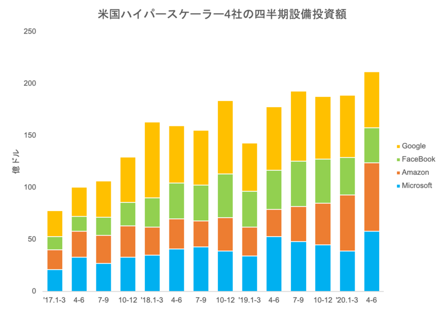 特にアマゾンとマイクロソフト(MS)の投資額が大きく増加しており、4~6月期はアマゾンが前四半期比2割増、MSが同5割増を記録した。一方で、グーグル、フェイスブック(FB)はコロナ禍による企業活動の停滞などから広告収益が急減。グーグルを傘下に持つアルファベットの4~6月期決算は前年同期比で2%の減収となり、上場以来はじめての減収に陥ったことが話題となった。広告に売り上げの多くを依存していた両社は、この事態を受けて設備投資のブレーキをかけており、大手4社でも明暗が分かれた格好となっている。