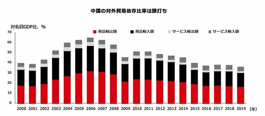 同国の対外貿易依存比率(商品・サービスの貿易総額の対GDP比)は2006年に64.5%でピークに達した後、減少に転じ、2019年は35.7%まで低下した。こうした中、新たな成長牽引役がまさに急務となっている。
