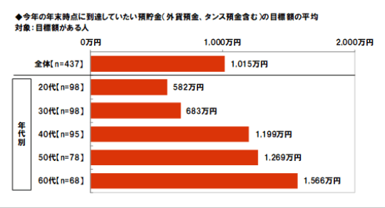 預貯金の目標額を聞いたところ、【今年の年末時点に到達していたい預貯金 (外貨預金、タンス預金含む) の目標額】では、目標額がある人 (437名) の目標額の平均は1,015万円でした。年代別にみると、20代582万円、30代683万円、40代1,199万円、50代1,269万円、60代1,566万円となりました。