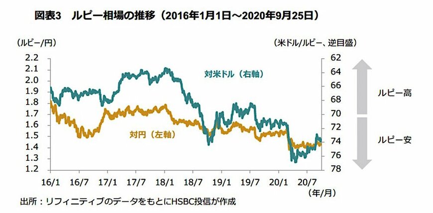 インドルピーは対米ドル、対円ともに、本年2月下旬から3月にかけて、新型コロナウィルスの感染者の世界的な広がりを受けた投資家のリスク回避志向の高まりを背景に、他の新興国通貨とともに急落した。その後は、対米ドルでは上昇に転じたが9月以降は売り優勢の展開、対円ではレンジ相場を続けている(9月25日現在)。