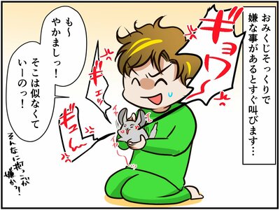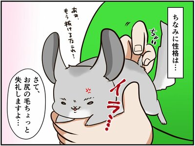漫画家の祭さんは、おみくじちゃんとあみだちゃん(♂で確定)というチンチラの母子、そしてデグーの棟梁ちゃんと一緒に生活しています。8月に産まれたチンチラベビーのあみだちゃん。生後2週間ほどは、なんとなくパパの小明神さんの面影はあるものの、まだまだ赤ちゃんの顔でしたが、近ごろはだいぶしっかりとした顔になってきました。