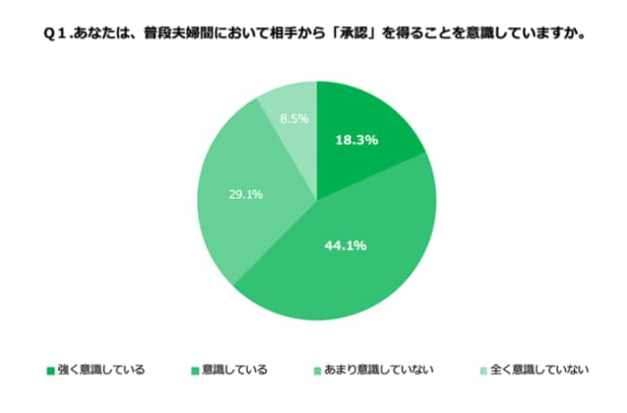 「普段から夫婦間において相手から承認を得ることを意識していますか?」という質問に対して「強く意識している(18.3%)」「意識している(44.1%)」という結果になりました。半数以上の人が認めてもらうことを必要だと感じているようです。
