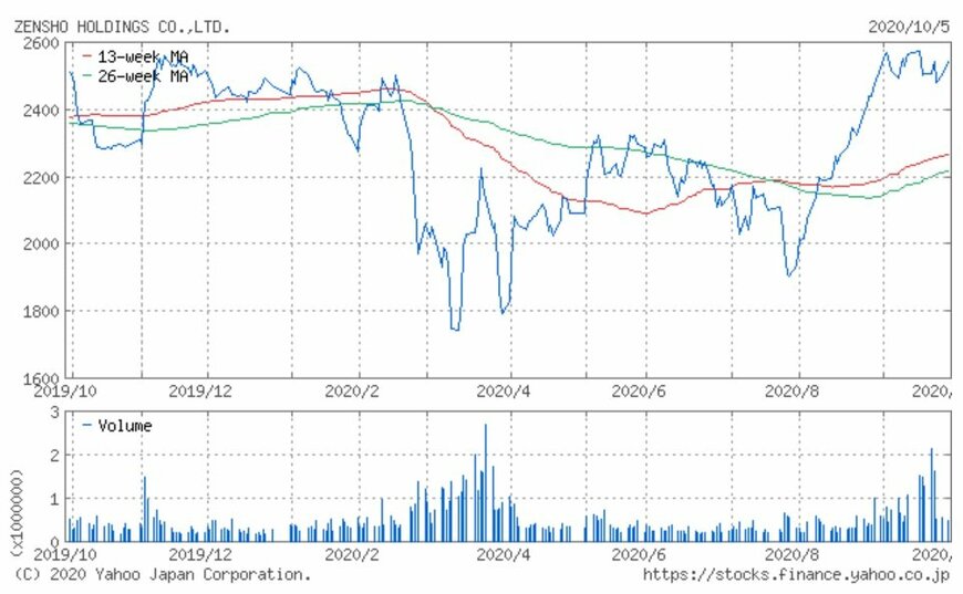 同社の2019年以降の株価は、2,500円台で天井を付ける傾向にありました。2020年も1月に高値2,535円を付けた後に下降を始め、世界的な株価下落を受けた3月には1,677円まで下落しました。その後はN字型での上昇を見せており、9月23日には年初来高値2,585円に到達し、現在は2,500円付近で取引が行われています。