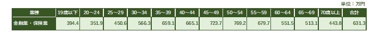 「金融業・保険業」に従事する人の前年代を通しての平均給与額は、631.3万円。他の業種の平均給与額と比較してみると、いわゆる規制産業といわれる「電気・ガス・水道」に続いて、2番目に高い金額となっていることがわかります。