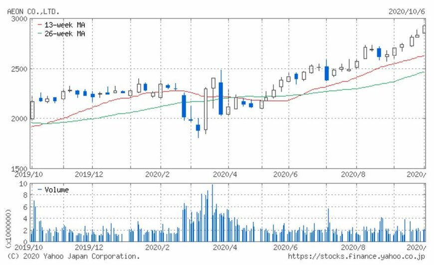 また、小売り株ではスーパー部門の売上好調が続くイオン(8267)の株価上昇が止まらず、この日も連日で年初来高値を更新しました。ちなみに、3月中旬のコロナ暴落時につけた安値から約+62%上昇しています。