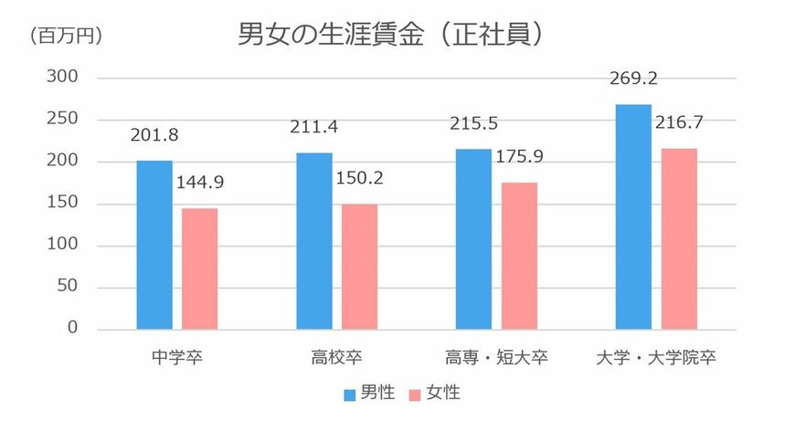 男性の場合、すべての学歴で生涯賃金は2億円を超えていますが、女性の場合、2億円を超えるのは大学・大学院卒だけです。男性と女性とでは、高専・短大卒でおよそ4,000万円、他は5,000万円以上の開きがあります。