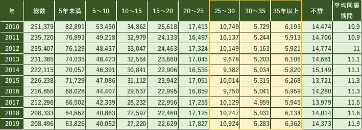 では、実際にどのぐらいの人が熟年離婚をしているものなのでしょうか?厚生労働省が公表している『人口動態調査』の2019年度版の結果より、同居期間別の離婚件数の推移を見てみましょう。(※)