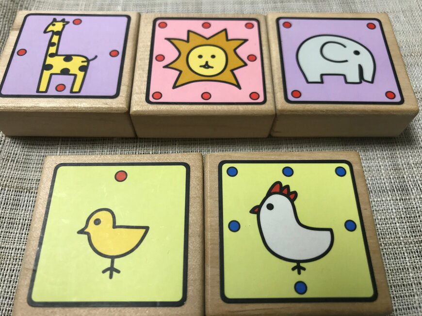 ライオンを「王様」として、ひよこ・ぞう・キリンが1チーム。優しい色合いの積み木のような駒には、それぞれの動物が進める方向がどの方向に動けるかの印がついています。