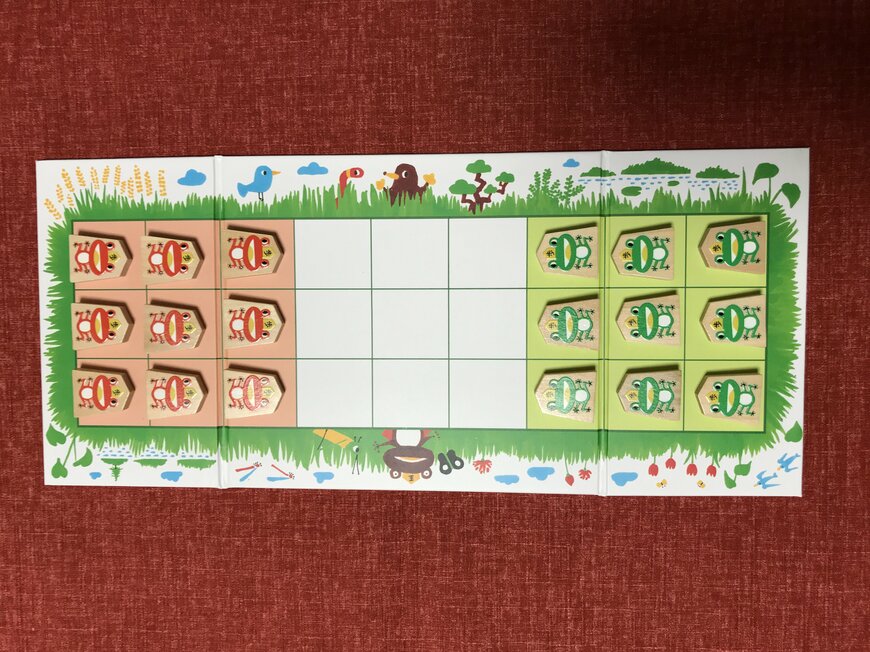 こちらは、「どうぶつしょうぎ」より、さらにワンステップやさしめのゲームです。緑の「ぴょん」と、赤の「がま」、それぞれ9枚(匹?)で対戦します。