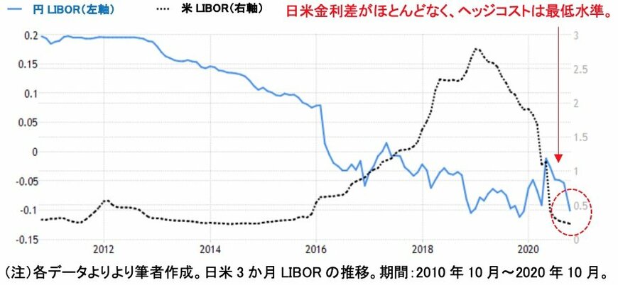 為替ヘッジにはコストがかかりますが、足元では年0.5%程度とわずかです(コストは変動する)。一般的なアクティブファンドの信託報酬より低くなっています。それほど気にする水準ではありません。