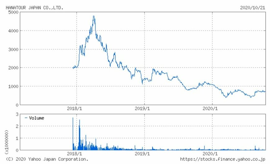 ハナツアーJの株価は、好業績だった2017年度の決算報告が発表された2018年初旬にピークを迎え、4,700円台を記録しました。