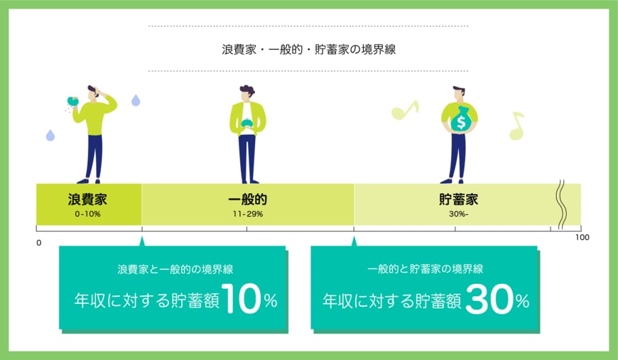 松井証券株式会社が行った「老後資金に関する調査」の中で、浪費家と貯蓄家を定義していました。「年収の貯蓄割合に関して、あなたが思うそれぞれの言葉の定義について教えてください」と質問をしたところ、浪費家は年収の10%以下を貯蓄している人、貯蓄家は年収の30%以上を貯蓄している人と結果が出ました(中央値で集計)。年収の11%〜29%は一般的とされています。