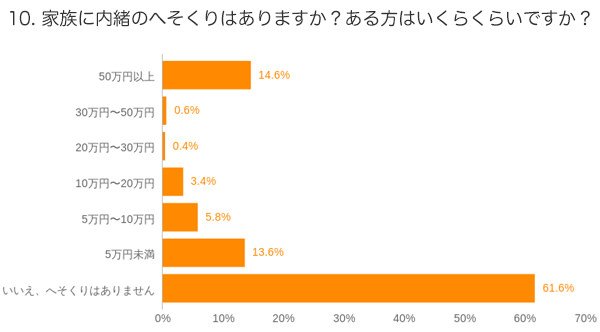 「家族に内緒のへそくりは無い」という回答をした人が多数派で、61.6%でした。その一方で、「50万円以上のへそくりがある」と回答した主婦が14.6%います。最近ですと、不用品をフリマアプリで売却してへそくりにしている主婦も多そうですね。