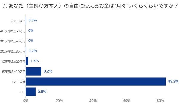 「無駄なお金は使わない!」と決めている主婦は多そうで、「自由に使えるお金は毎月5万円未満」と回答した主婦は83.2%に達しました。また、「自由に使えるお金は毎月0円」だという主婦も5.8%います。専業主婦で、パートやアルバイトをしていない場合によくある話のようですね。たまには息抜きもしたいところですが、あくまでも家庭のことを優先する気持ちが伝わってきます。