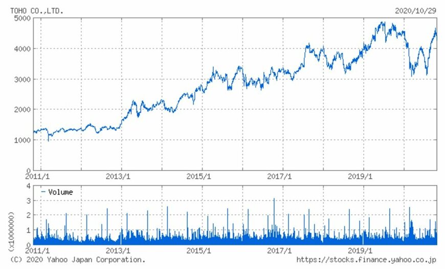 『鬼滅』の大ヒットを先取りする形で、東宝の株価は上昇しています。同社株価の最高値は2019年6月の4,915円ですが、『鬼滅』公開後の10月19日には4,700円を一時回復しました。