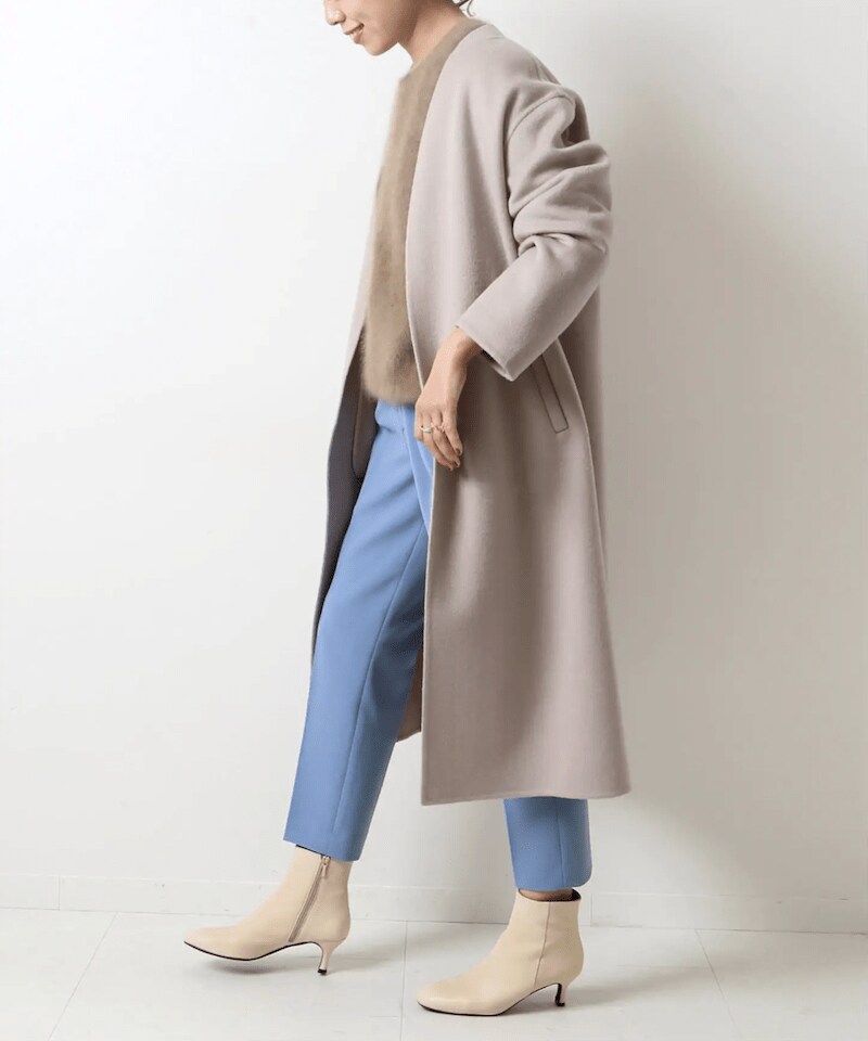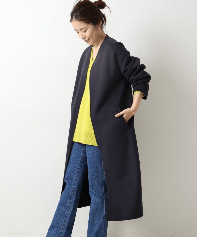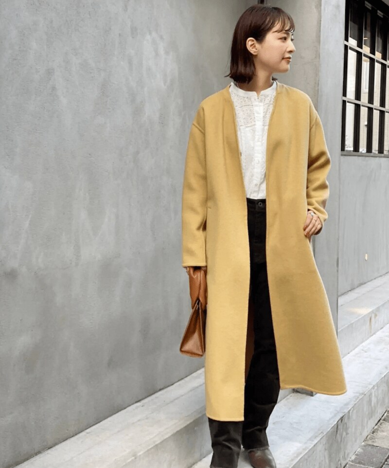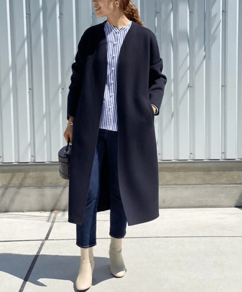 すっきりとしたノーカラーのデザインで、ストール、フーディー、タートルネックとも好相性。ほどよくゆとりがありながら、すとんと落ちる真っ直ぐな美シルエットが人気の理由です。