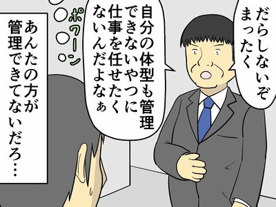食欲の秋。「ちょっと太ったんじゃないか?」と、部下に指摘する上司。その後も、自分の体型を棚に上げ「自己管理がなってない」「だらしない」「仕事を任せられない」と、独自の仕事論を言いたい放題…。