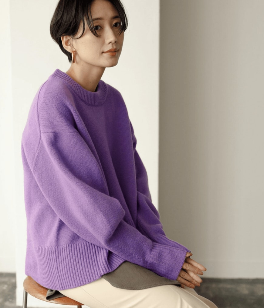 一見取り入れづらそうなカラーでも、ベーシックな形のニットなら着回しやすいんです! 日頃シンプルなスタイリングが多い方にこそ、ぜひチェックして欲しいアイテムです。