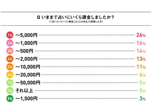 占いのコンテンツにお金を使ったことがある(課金をしたことがある)かどうか質問をしたところ、82%が「ない」と回答しています。課金をしたことがある人にその金額を聞いてみると「5,000円以内」が26%、「1,000円以内」が16%、「500円以内」が14%となりました。中には「10万円」「30万円」「50万円」と高額な回答もありました。