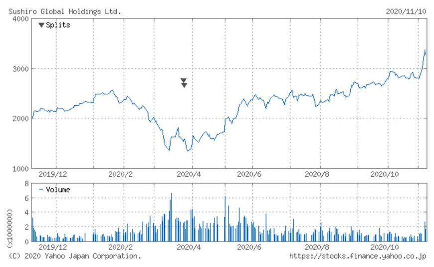 しかし反転して7月に一時2,600円台に到達。その後も緩やかな上昇が続き、10月9日には高値3,010円まで上昇しました。現在は若干下落した2,800~2,900円付近での取引が続いています(注:2020年3月31日に1→4株の株式分割を実施)。