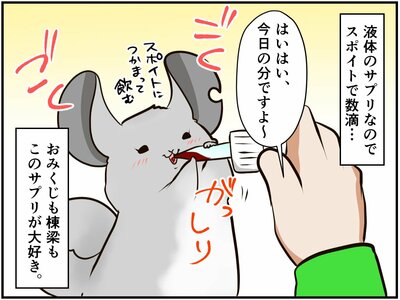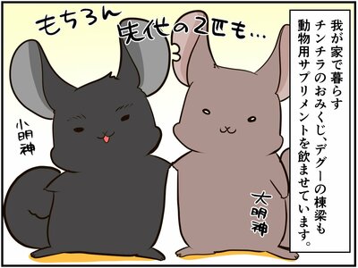 健康維持のため、おみくじちゃんと棟梁ちゃんに動物用サプリメントを与えている祭さん。「そろそろ、あみだちゃんもサプリメントデビューを」ということで、試してみたら…?