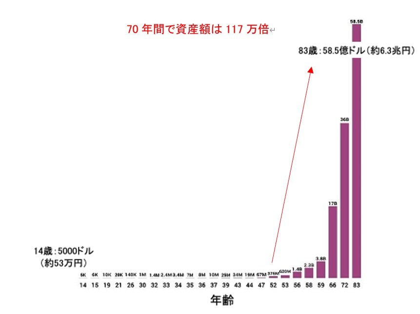 バフェット氏が講演でよく使う表現に、「今日日陰で休めるのも、誰かがその木を植えたからだ」というものがあります。資産は一晩で築けるものではなく、時間と忍耐が必要だという教えです。下図のように、バフェット氏でさえ資産のほとんどが50代以降に築かれています。