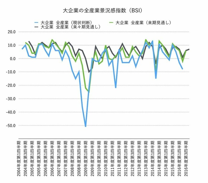 この時期は、円高に加え、熊本地震があったことから、自動車やスマートフォン向け部品が落ち込み、大企業の製造業のBSIが-11.1となりました。また、非製造業も、日銀によるマイナス金利導入の影響から金融業や保険業が振るわず、大企業の非製造業のBSIは-6.3となりました。