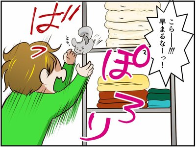 漫画家の祭さんは、おみくじちゃんとあみだちゃんというチンチラの母子、そしてデグーの棟梁ちゃんと一緒に生活しています。乳離れをし、母親のおみくじちゃんとは別のケージで暮らしはじめたやんちゃ盛りのあみだちゃん。好奇心も旺盛とあって、お散歩タイムなどは、ちょっと目を離しただけでも姿が見えなくなってしまいます。