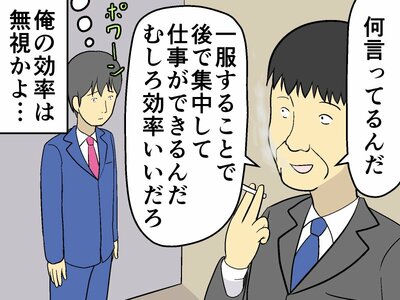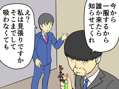 愛煙家にとって、仕事の合間の一服は貴重なリラックスタイム。とはいえ、最近は職場もお店も、タバコを吸うことができる場所は減る一方。そこで上司は、部下をカモフラージュに、こっそりタバコ休憩をとろうとしますが…。