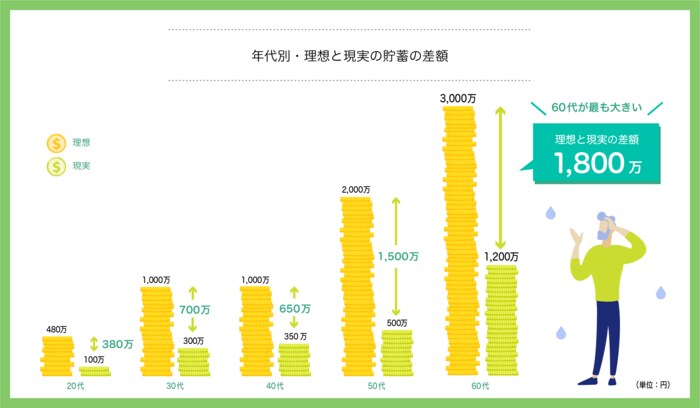 世帯貯金額は年齢が上がるにつれて理想と現実にギャップ