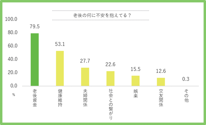 「あなたは、何に不安を抱えていますか。」と尋ねたところ、1位 「老後の資金(79.5%)」、2位「老後の健康維持(53.1%)」、3位 「夫婦関係(27.7%)」という結果になりました。コツコツ貯蓄をしているとはいえ、お金の面で不安を感じている人は少なくありません。