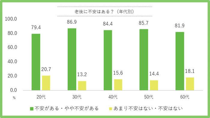 「あなたは、老後に不安がありますか。」と尋ねたところ、全体における83.6%が「老後に不安がある」と回答しました。年代別でみても、大きな差がなく、各年代で約8割の人が不安を感じています。何に対する不安か深堀してみましょう。