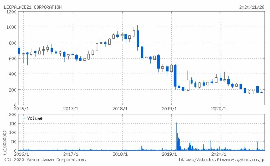当然ながら株価は下落しており、問題発覚前の18年4月に900円台だった株価は19年には200〜400円の間を上下し、今年の7月以降は200円を下回りました。