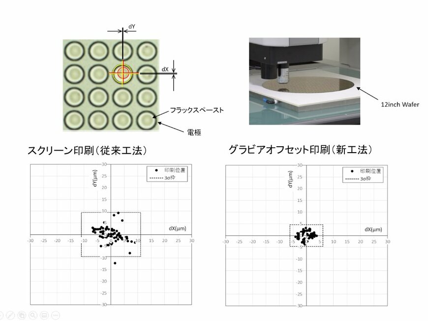 グラビアオフセット印刷はもともと微細な印刷を得意としており、ドット径はφ10μm程度まで形成可能としている。長らく続いた、「極小バンプの電極接合はめっき」という業界常識を根底から覆す画期的な技術といえる。量産適用の時期が注目される。