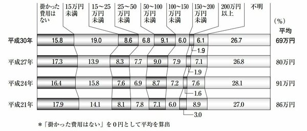 図2のように、「掛かった費用はない(15.8%)」「15万円未満(19.0%)」と、比較的費用がかかっていない割合が高いものの、なかには100万円以上かかっているケースもあり、ある程度の備えがあったほうが安心と言えるでしょう。
