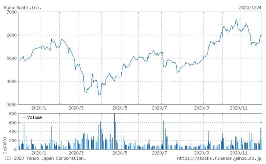 シリーズでお伝えしている「注目小売店月次実績」。今回は回転寿司チェーン店「くら寿司」を運営するくら寿司(2695)の2020年11月の月次動向及び過去実績、また過去1年の株価動向について振り返ってみましょう。