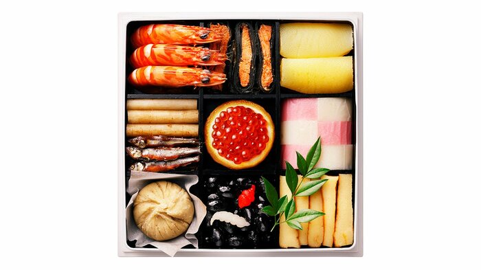 車海老の酒蒸し、紅鮭の昆布巻き(北海道・やました)、数の子(北海道・井原水産)、たたきごぼう(京都・野呂本店)、イクラの柚子釜(北海道・丸亀)、紅白かまぼこ(富山・河内屋)、小鮎の佃煮(滋賀・一湖房)、黒豆(東京・あんや)、平伊達(静岡・川雄)、栗きんとん(岐阜・松月堂)
