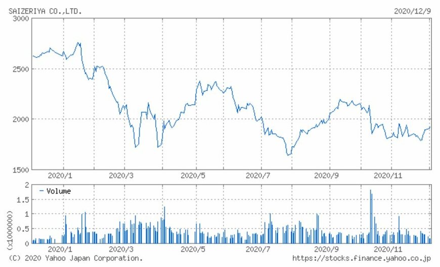 同社の株価は2019年から2,800円台を天井とする値動きが続いており、2020年1月も2,811円到達後に反落しました。また2月からの株式市場全体の急落を受け、4月には1,608円まで下落しています。