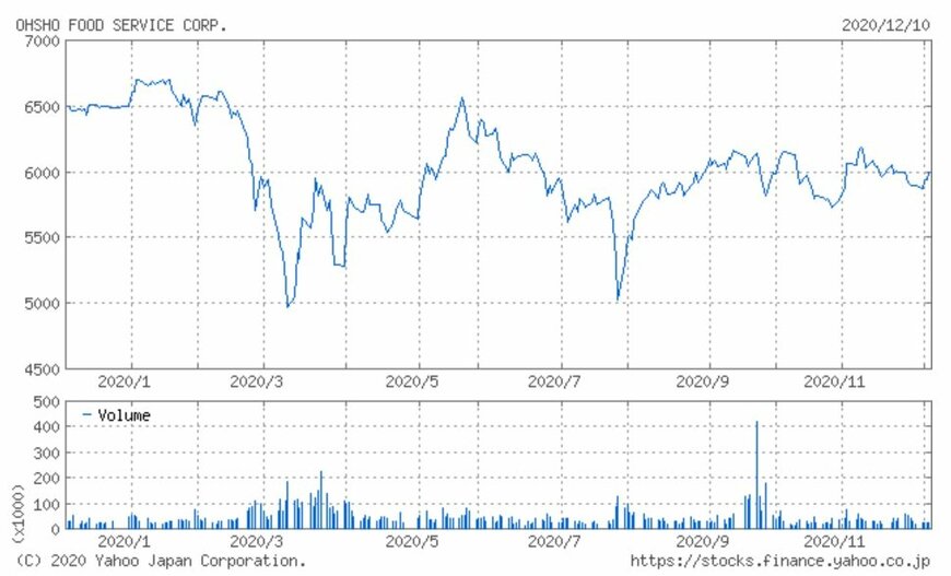 同社の株価は、2018年10月に8,050円の高値を付けた後は下落が継続しています。2020年は6,500円付近での取引開始後に下落しており、3月には4,670円の安値に到達しました。その後はリバウンドして5月に一時6,500円台を回復したものの再び下落して、9月後半からは5,700~6,200円間での取引が継続中です。