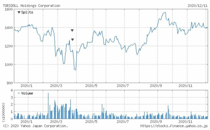 シリーズでお伝えしている「注目小売店月次実績」。今回はセルフ式うどん店「丸亀製麺」他を運営するトリドールHD(3397)の2020年11月の月次動向及び過去実績、また過去1年の株価動向について振り返ってみましょう。