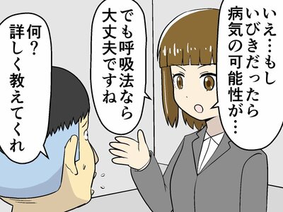 すると目を覚ました係長。開口一番「寝てないぞ!今のは、ほら、あれだ。何とかの呼吸法だ。今から全集中して仕事をするんだよ。」と主張しだします。主人公が「言い訳が苦しすぎるだろ…。」と心の中でつっこむと同時に、頭の中で、いつものごとく妄想スイッチが入ります…。