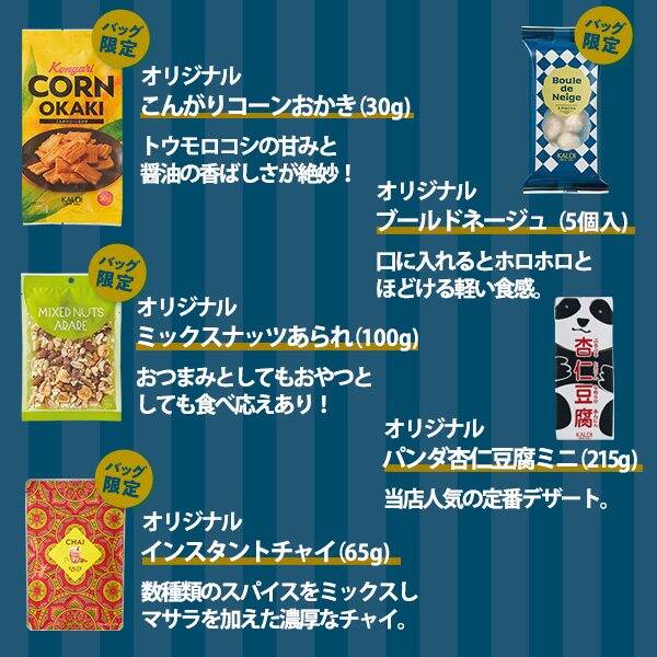 しかもバッグの中にはカルディオリジナル食品が5点。手軽なおやつにピッタリな「こんがりコーンおかき」「ミックスナッツあられ」「ブールドネージュ」に加え、「インスタントチャイ」「パンダ杏仁豆腐ミニ」が入って税込1530円はかなりのコスパといえるのではないでしょうか。