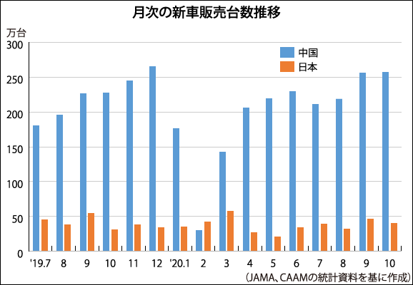 2020年10月における新車販売台数をみると、中国では前年同月比12.5%増の257.3万台となり、4月以降7カ月連続で前年を上回る成長を継続するとともに、5月から6カ月連続で2桁の高成長を記録している。内訳は、乗用車が同9.3%増の211万台、商用車が同30.1%増の46.4万台と大きく伸長した。